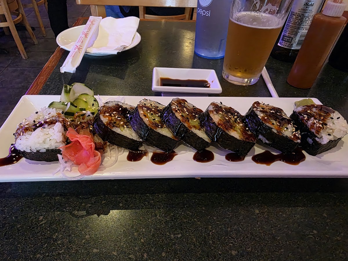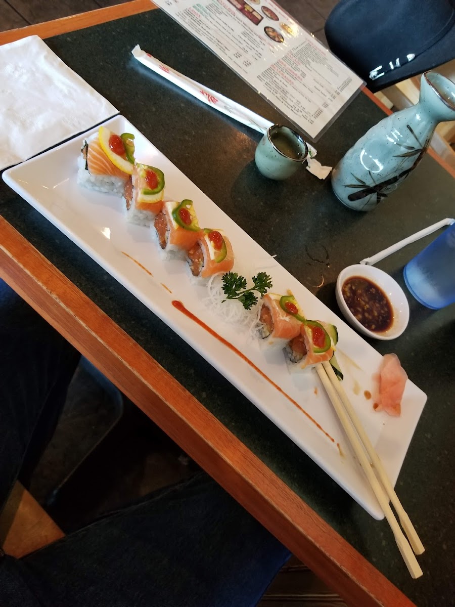 Ordered nigiri, two large rolls, and green tea. The maguro nigiri was good, very generous size and well prepared. The first of the two rolls was a "Hot Night Roll" with spicy salmon, and cucumbers on the inside, salmon, thin sliced lemon, jalapeno, and a dot of Sriracha. It was really excellent, the only flaw being one slice of lemon was a little thick which made that one piece chewy. The second was a classic, a spider roll, and everything was exactly as it should be. The servers were friendly, attentive, and kept the green tea hot and as full as we wanted. Really enjoyed this place.